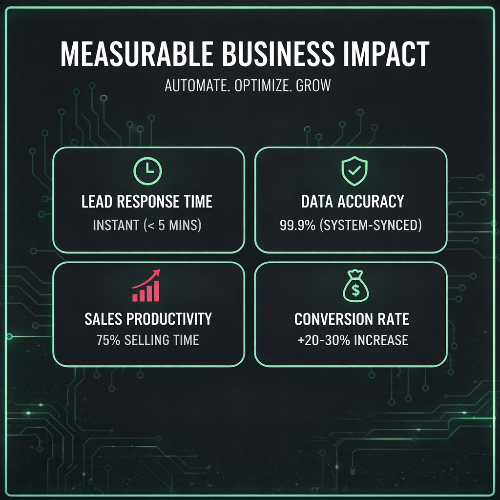 With instant lead response times, system-synced data accuracy, and intelligent automation working together, your business eliminates delays, manual errors, and disconnected workflows that slow growth.